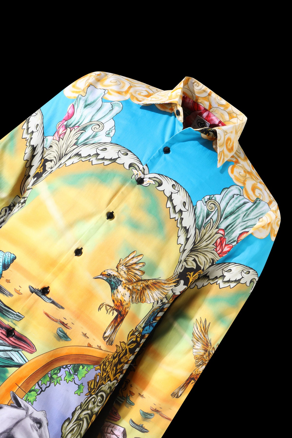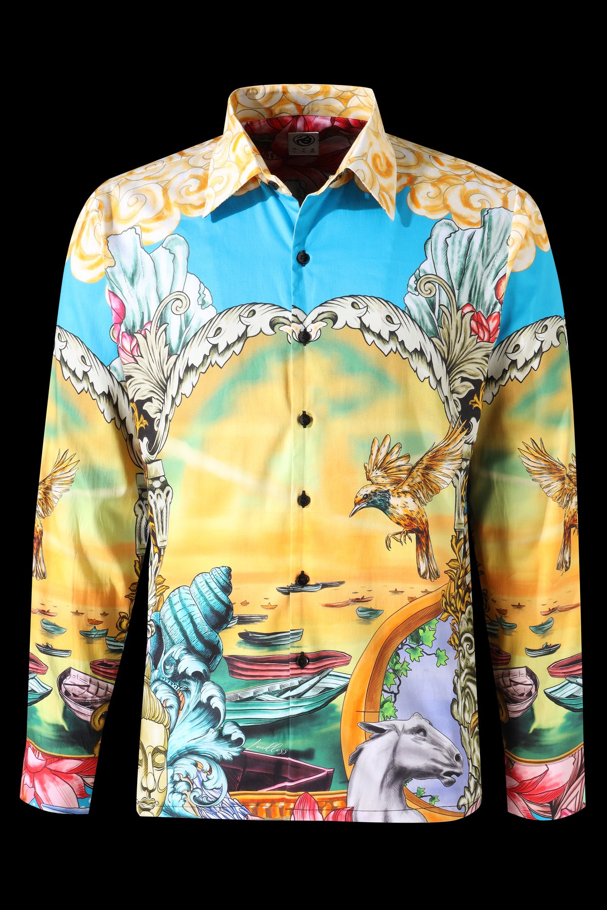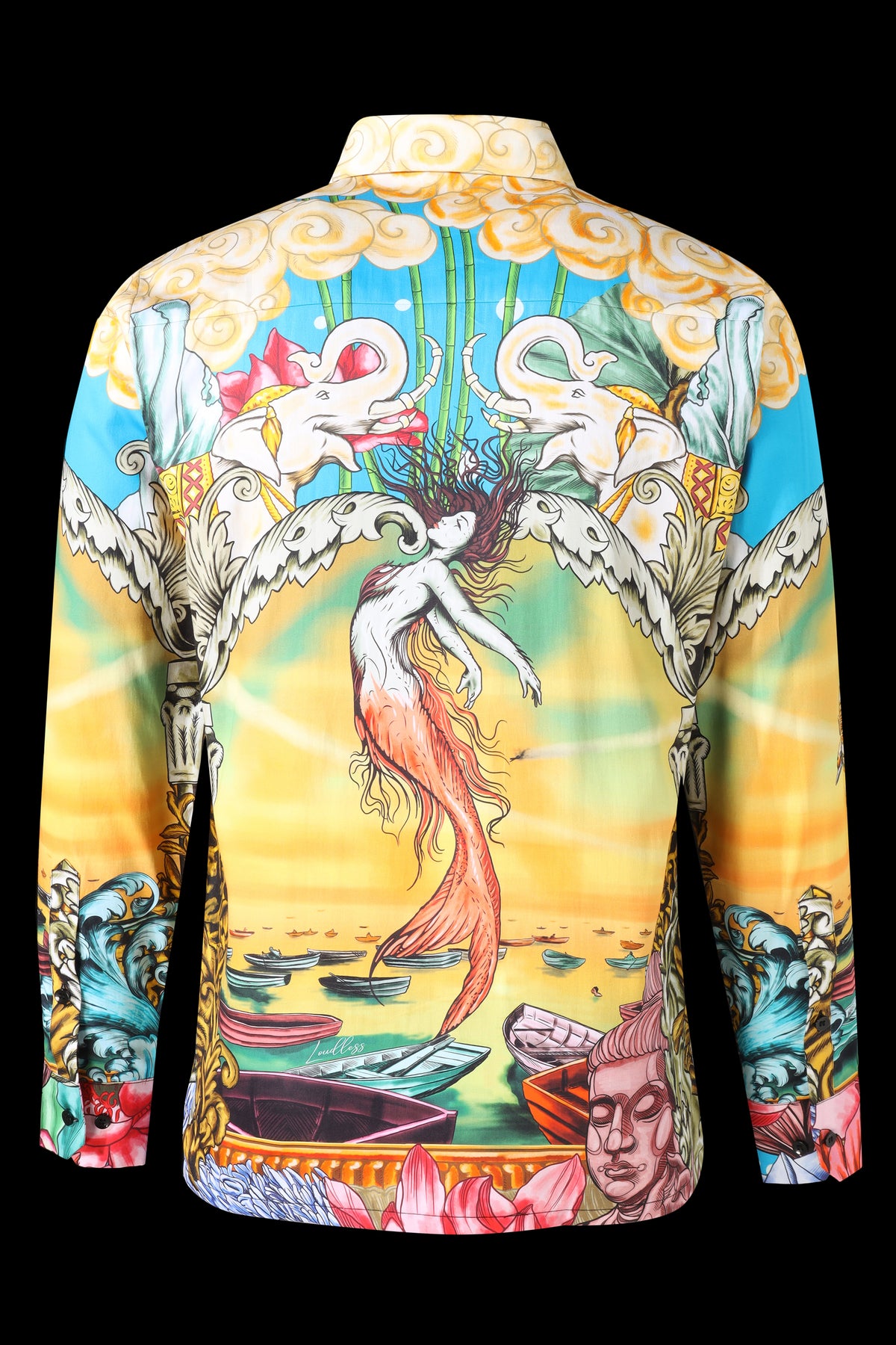 Mermaid sitting on a rock at sunset, surrounded by human figures, floral patterns, and architectural elements. Faces of statues are integrated into the design, along with vibrant flowers such as lotuses, lilies, and roses. The scene is symmetrical, with mirrored elements and intricate patterns, blending mythological imagery, natural motifs, and classical ornamentation into a unified composition.